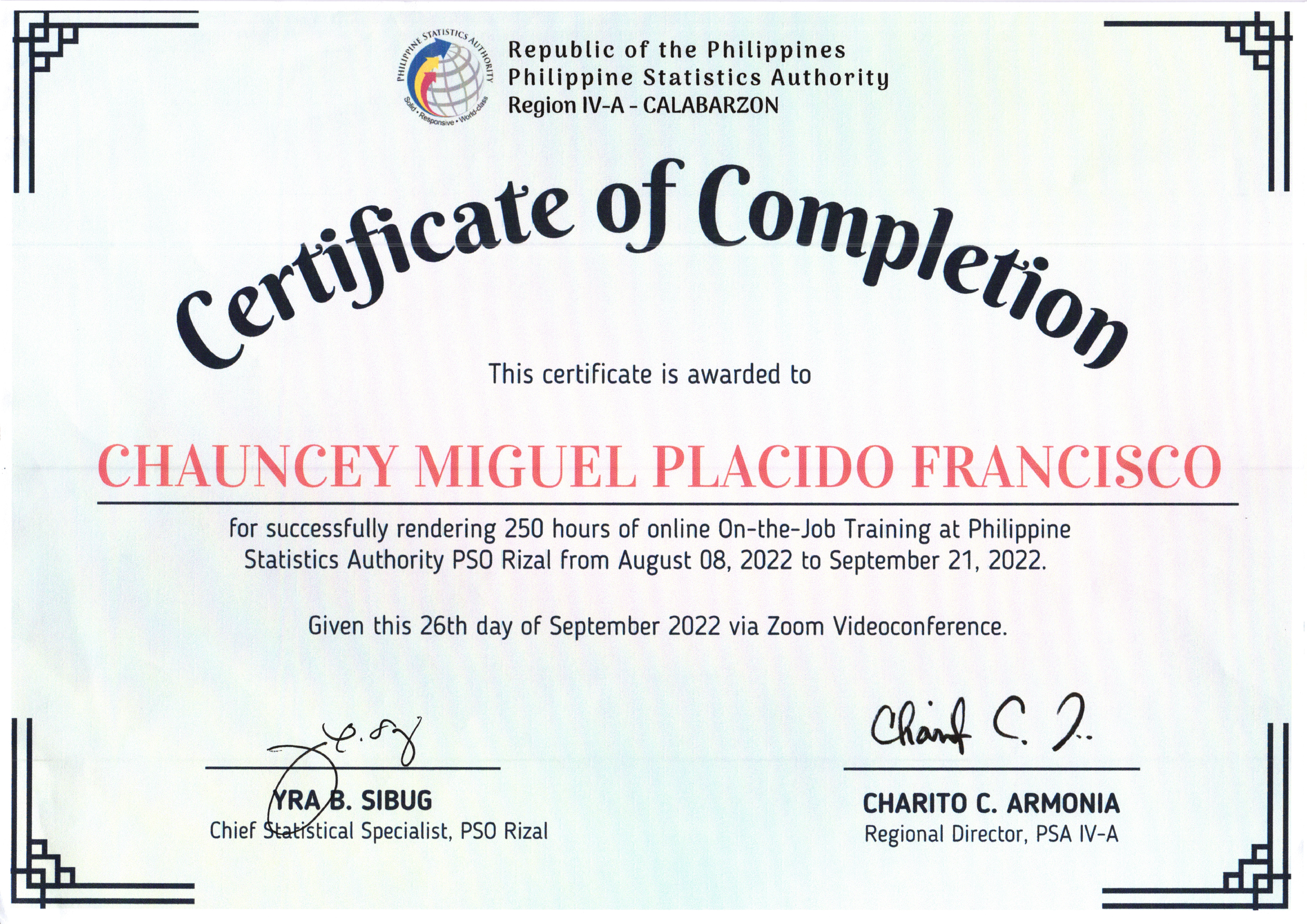 I took an internship in 2022 in the Philippine Statistics Authority - Rizal (PSA - Rizal) where I was offered the position of an